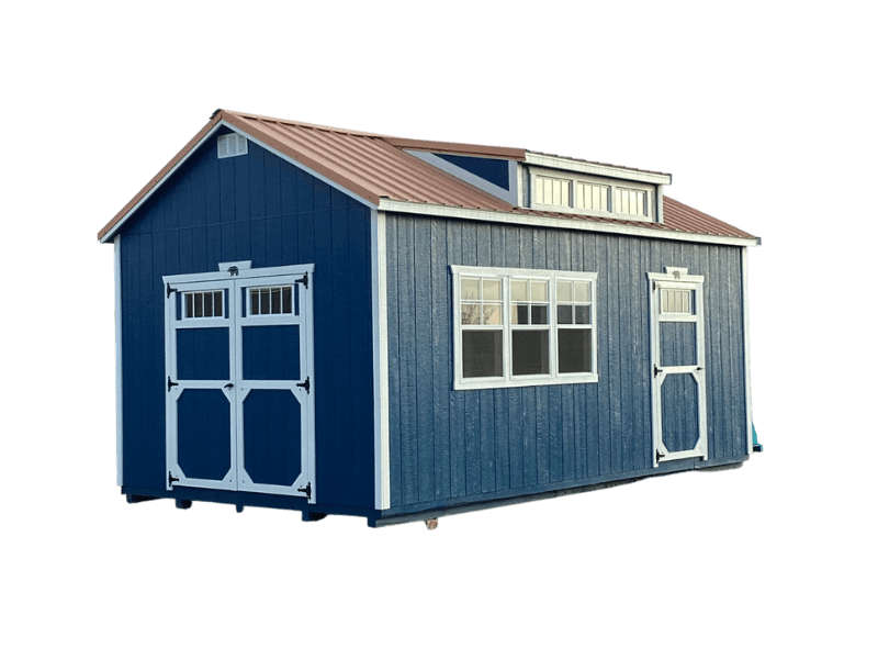 Elegant shed with a dormer and charming Cape Cod appeal.