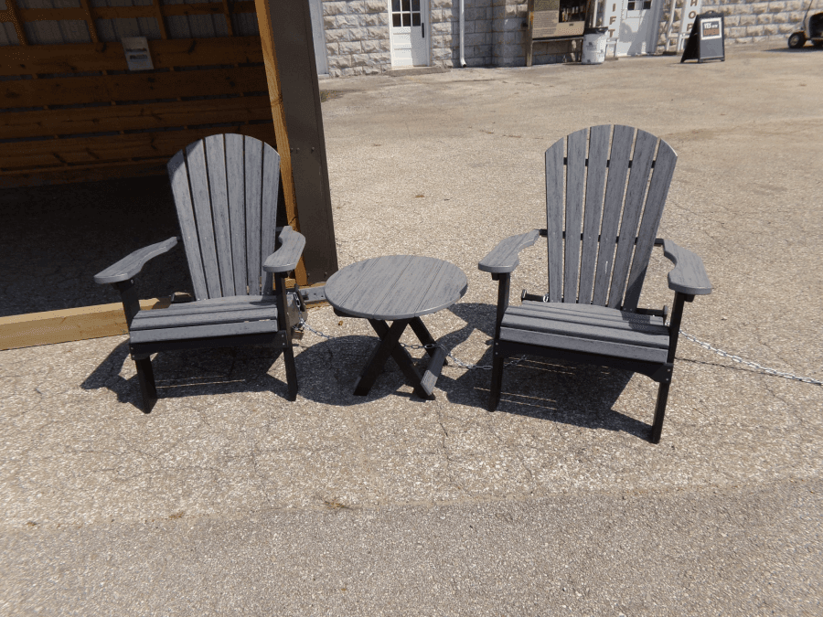 The gray on black Adirondack table set features signature best sellers of this polywood outdoor furniture set, they’re available in a variety of color options. Featuring an elegantly curved back with a gently sloping seat, it is extremely comfortable as well as practical. Sit back on your deck, at the beach or practically anywhere and enjoy the day with family and friends. This set comes paired with a Round Side Table to keep your coffee or ice cold drink within reach!